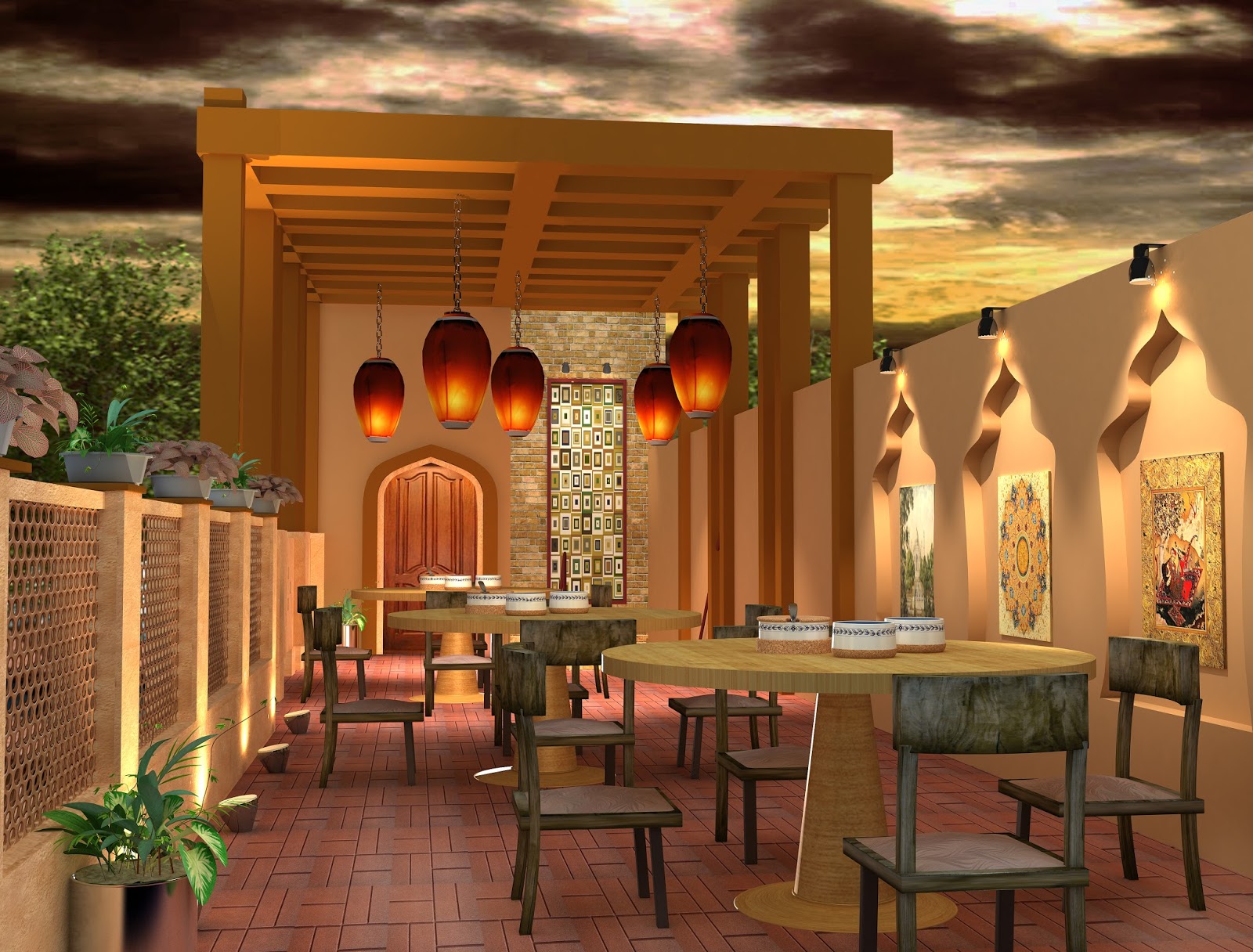I visited the site and realized that the place offers more seating space outdoors i.e. in an open space on ground floor and upstairs on first floor, which was again open to sky. Hence I decided to incorporate Mughal Architecture style items such as arches, paintings and woodwork to give a historical feel. I also tried to use many lighting fixtures because in Lahore, people tend to come out of their houses at night and outdoor ambiance can be enhanced only if sufficient lighting is present. I proposed the materials such as Limestone or limestone plaster as well which were mainly used during that time and that is the place from where the Mughal look comes.